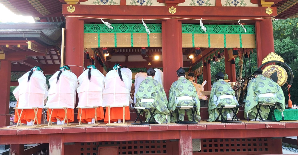 It is a Shinto ritual that celebrates the season of harvest and expresses gratitude for well-being throughout the summer. Crickets in small cages are offered before the deities, and the ceremony is conducted at the Maiden (dance pavilion) of the shrine.