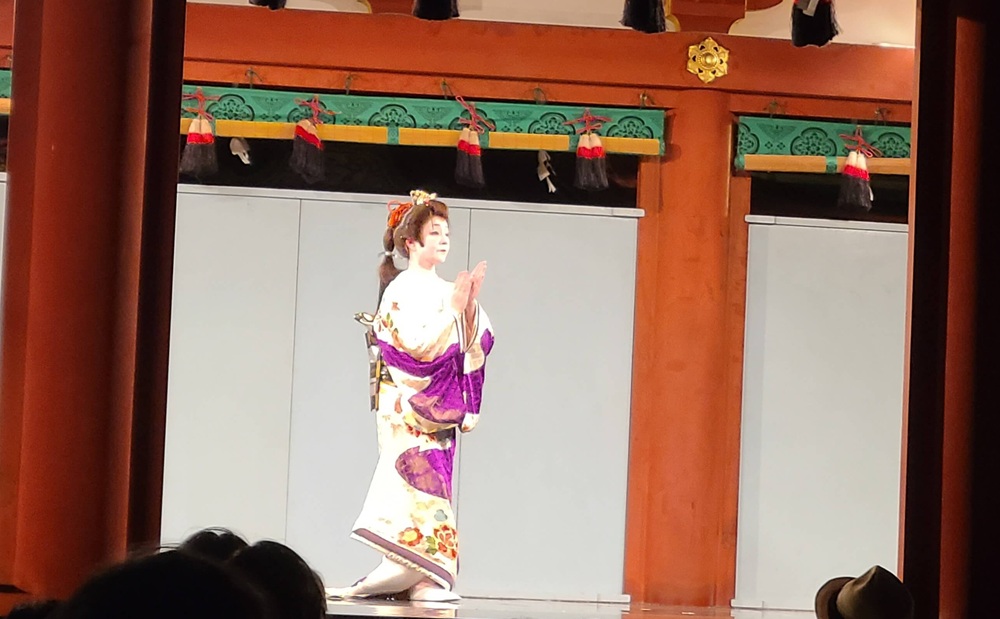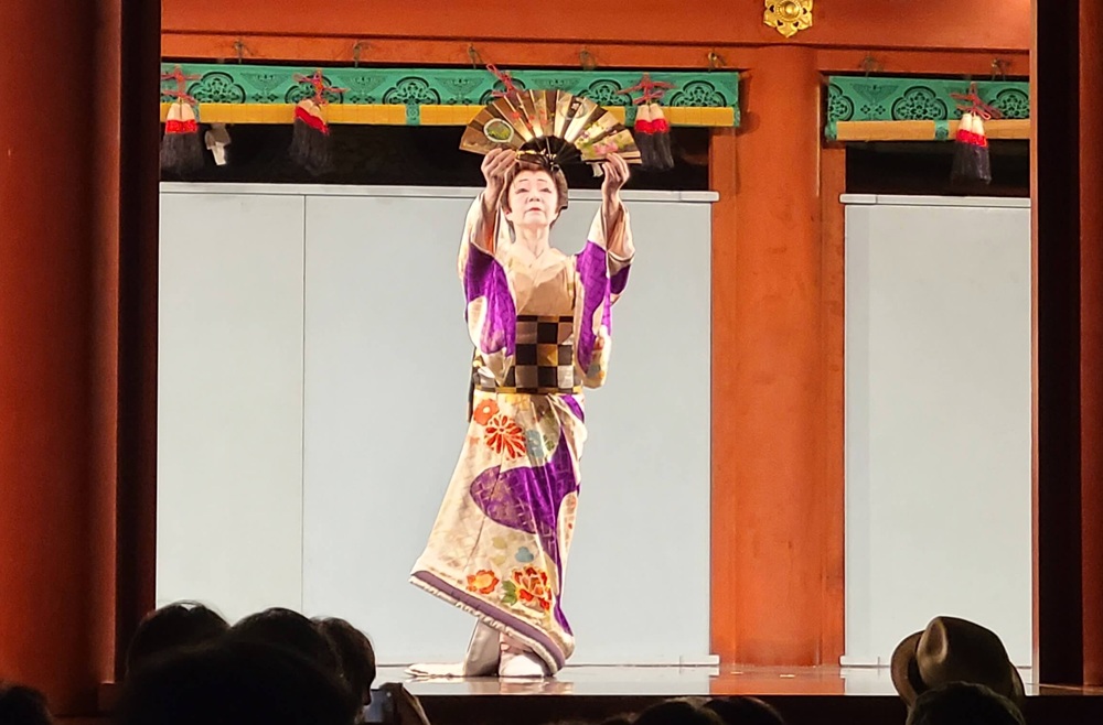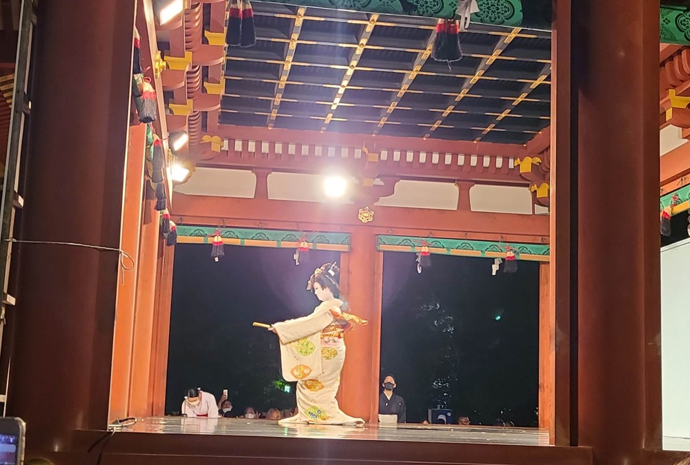 ぼんぼりへの火付けも終わり、暗くなると舞殿で日本舞踊が奉納されます。こちらも必見です。