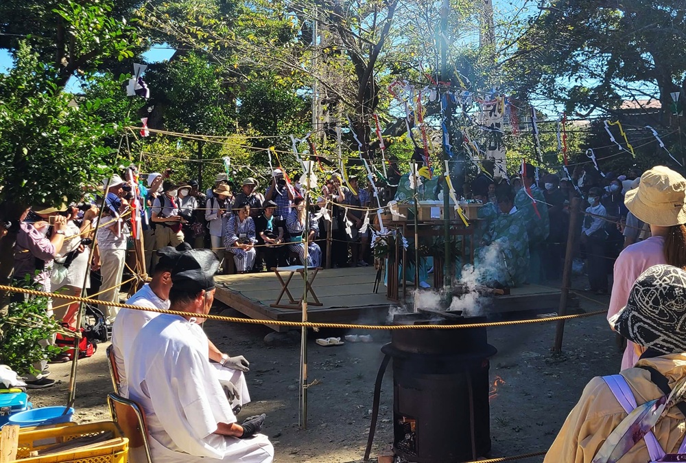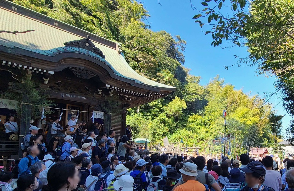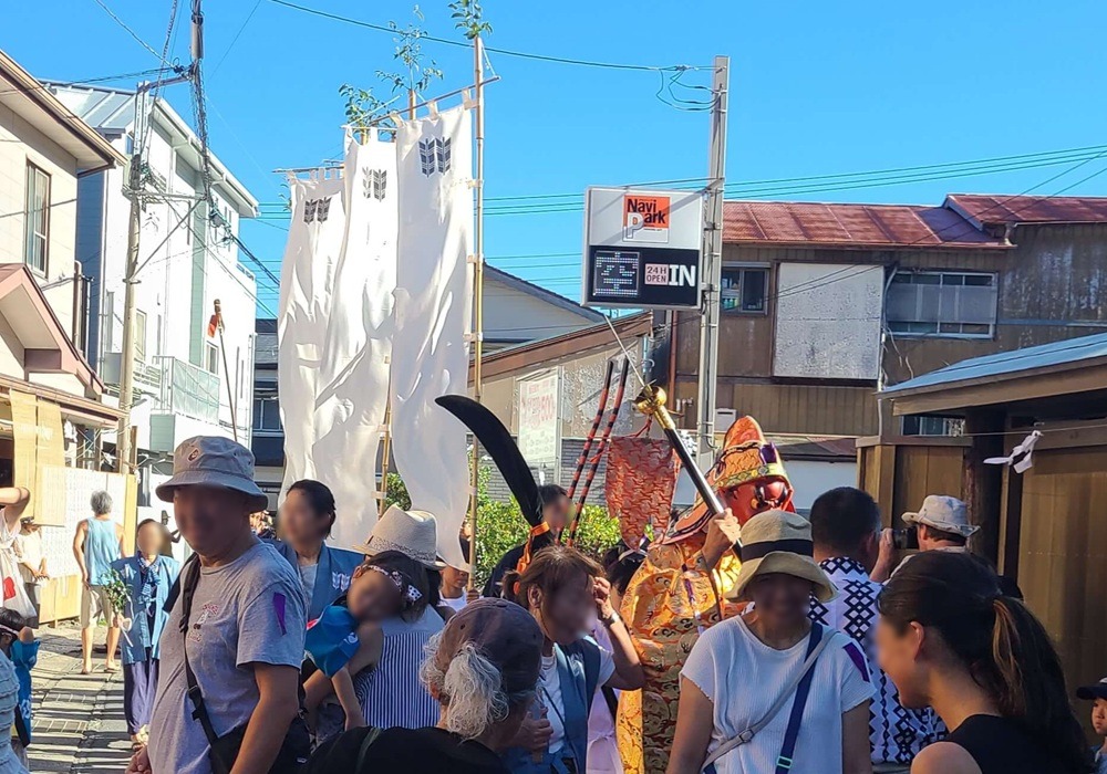 例祭では五穀豊穣を祈るものとして、釜に煮立てた湯の中に笹を入れて湯玉を散らす「鎌倉神楽(湯立神楽/湯花神楽)」を奉納され、星の井通りを中心に坂ノ下町内を神輿渡御も行われます。この神幸の行列の中に、伎楽面や舞楽面、田楽面をつけた10人の面掛衆が練り歩く県の無形文化財に指定された「面掛行列」が含まれています。(出典:鎌倉観光公式ガイド)