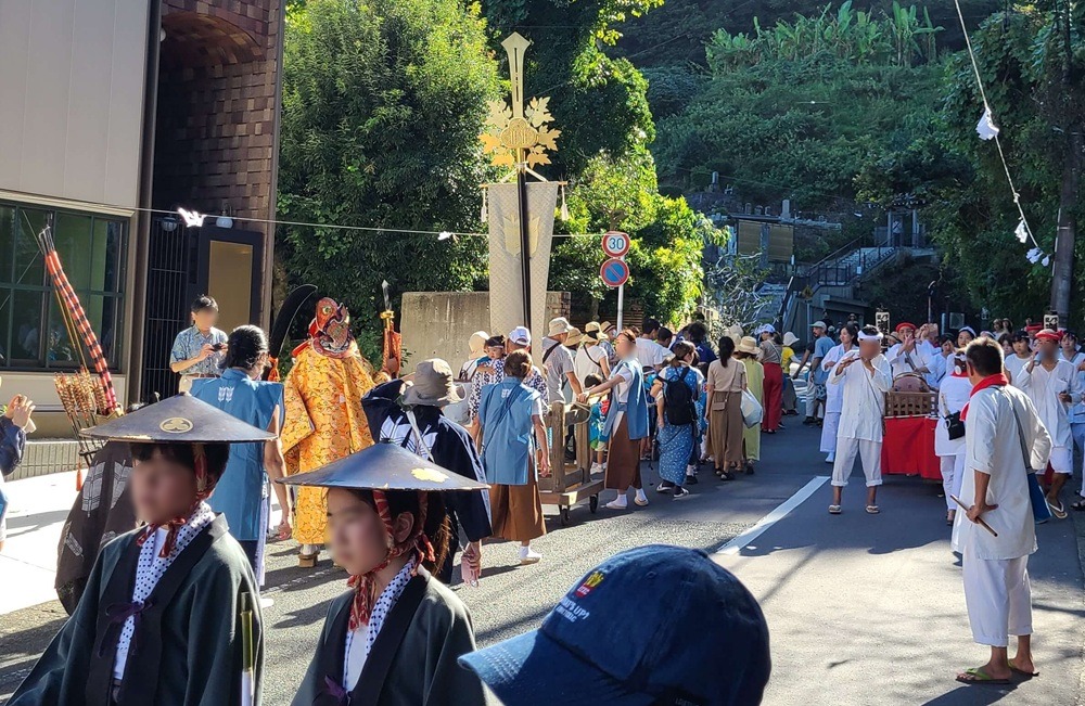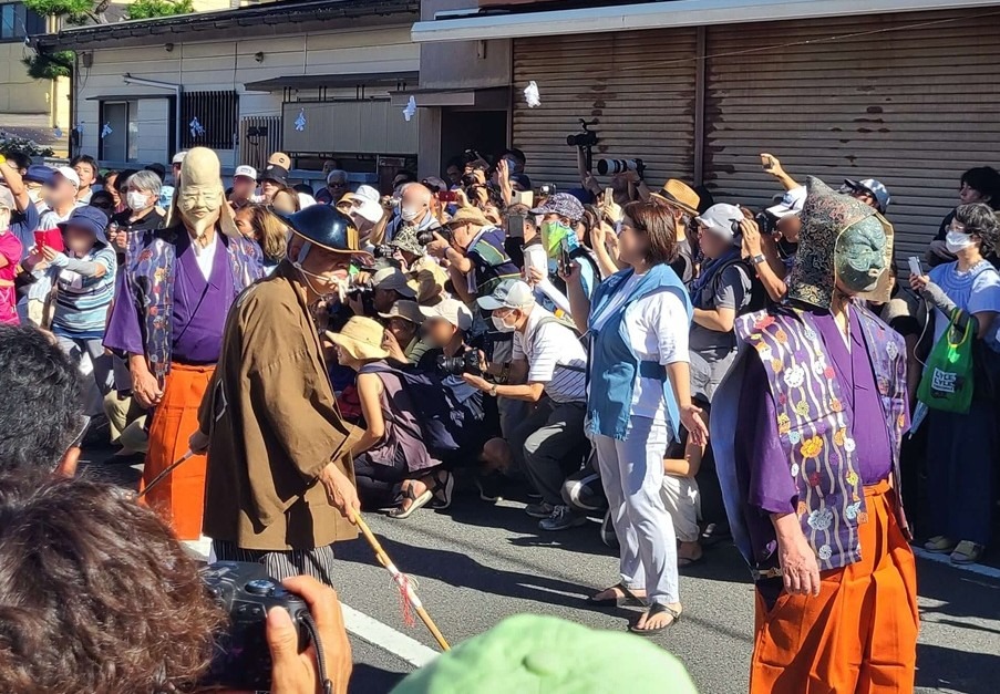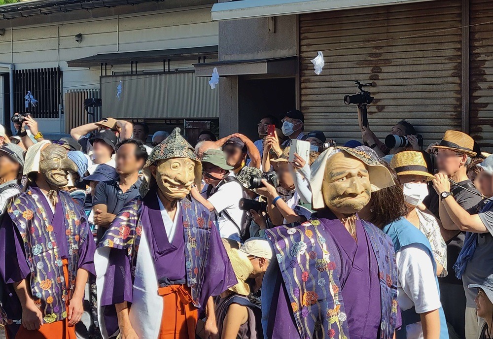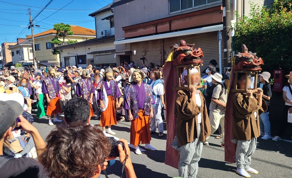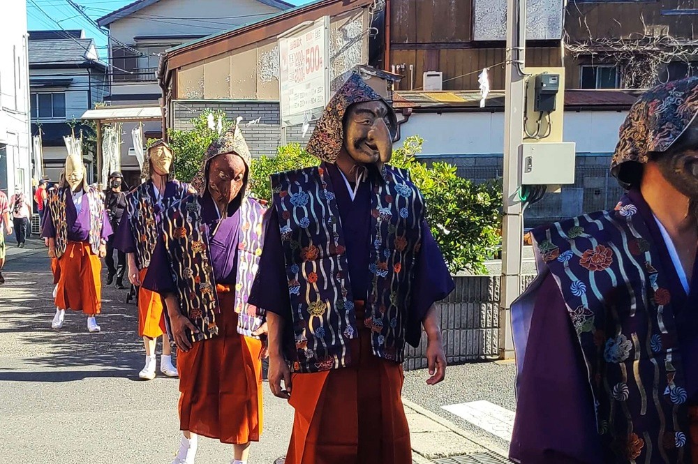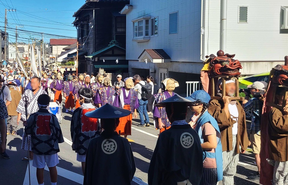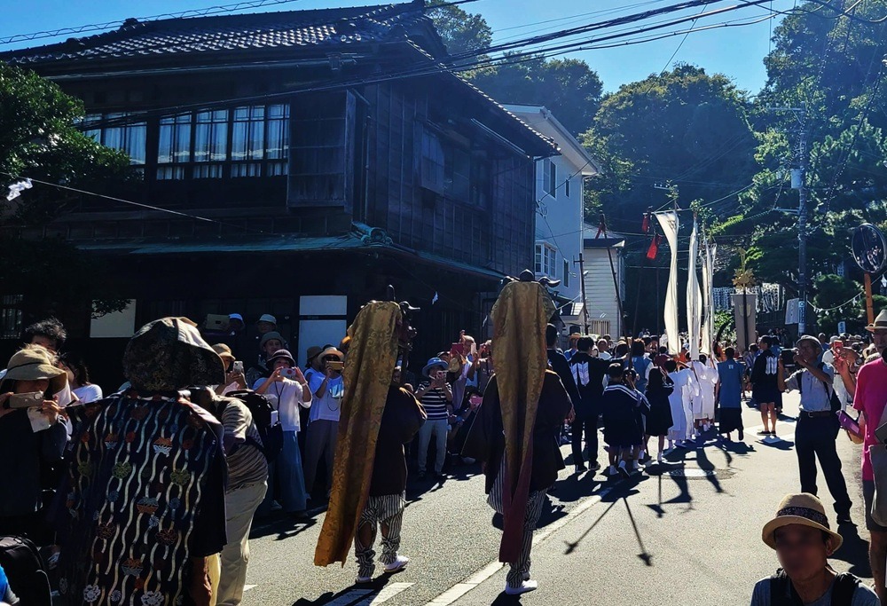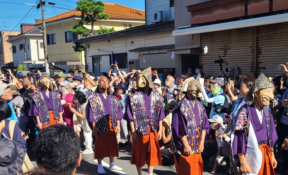 They parade from Goryo Shrine up to the slope of Gokuraku-ji, praying for a bountiful harvest and abundant catch. The procession is said to have been modeled after the masked dance parade of the Hōjō-e festival at Tsurugaoka Hachimangū Temple and has been held for over 200 years.