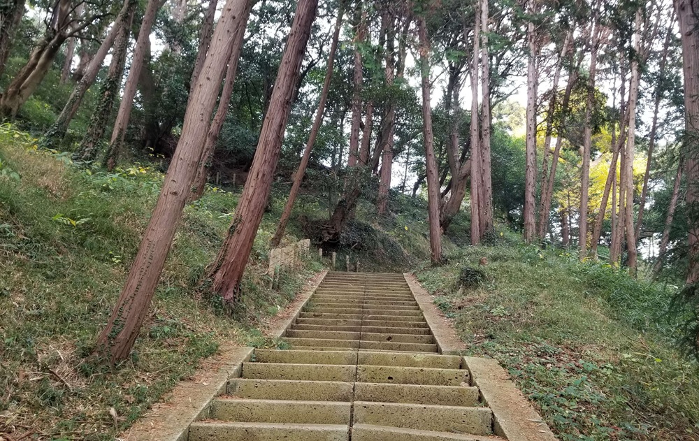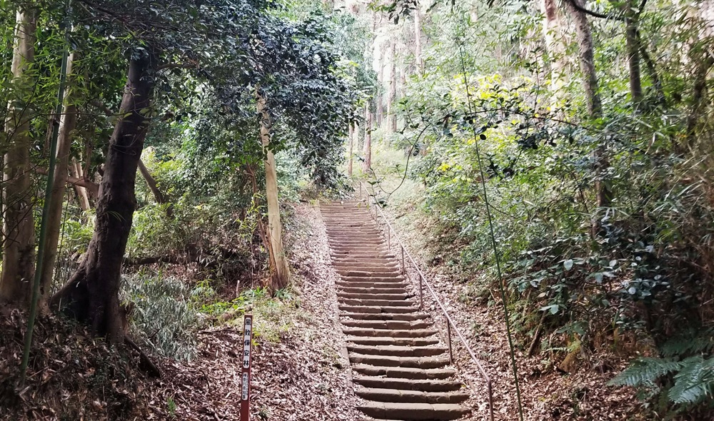 入り口を入っていくと長い階段がありますので、まずは登りましょう!