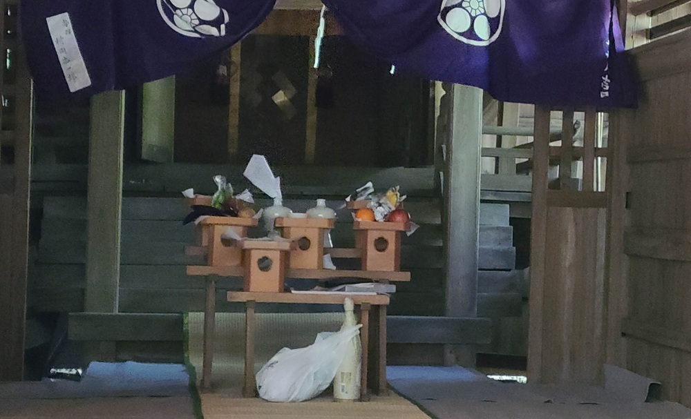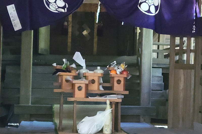 神主の詔で30分ほどで終了、神楽もなし。お餅と紅白饅頭をいただきました。