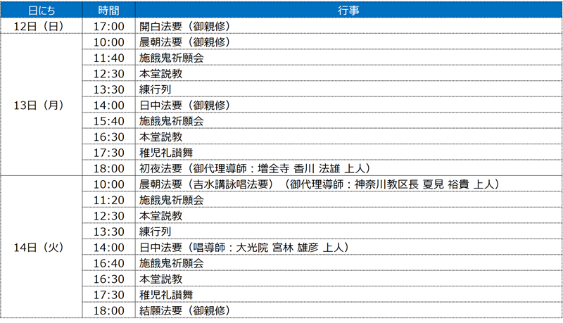 個人的には、13日か14日の施餓鬼会から本堂での説教、練行列あたりでしょうか・・