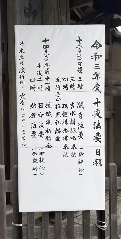 At Kōmyō-ji Temple, the Jūya Hōyō is performed in accordance with ancient tradition, using hiki-goe Amida-kyō (elongated chanting of the Amida Sutra) and hiki-goe nembutsu. The temple is lively with worshippers both day and night throughout the observance.