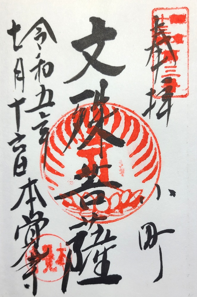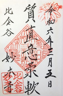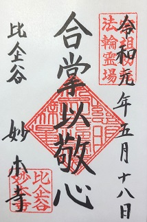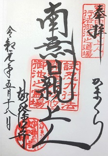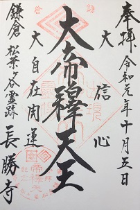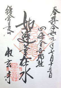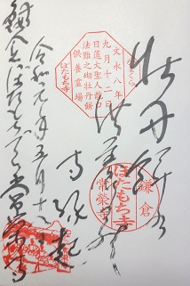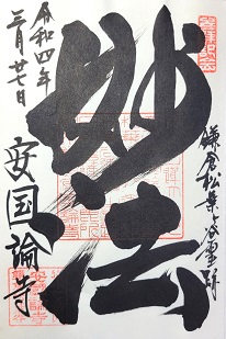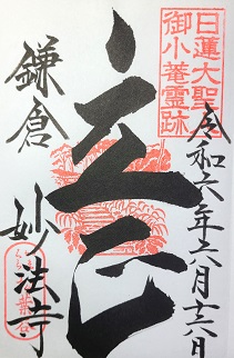 鎌倉にある日蓮宗のお寺は、安國論寺、妙法寺、妙本寺、長勝寺、光則寺、實相寺、薬王寺、妙長寺、本龍寺、勧行寺、法源寺、妙典寺、本成寺、上行寺、本興寺、東漸寺、妙隆寺、本覚寺、大寳寺、啓運寺、仏行寺、久成寺、大巧寺、常栄寺、収玄寺、妙法寺、霊光寺、妙傳寺、圓久寺、護国寺、本行寺、龍口寺(藤沢市)とありますが、その中でいただけた御朱印です。