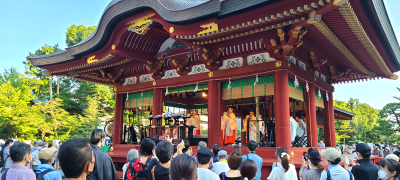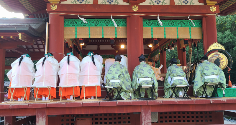 It is a Shinto ritual that celebrates the season of harvest and expresses gratitude for well-being throughout the summer. Crickets in small cages are offered before the deities, and the ceremony is conducted at the Maiden (dance pavilion) of the shrine.