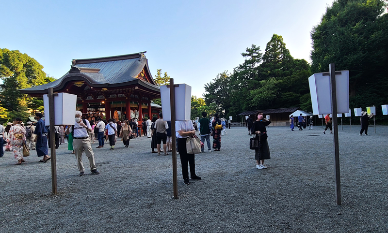 17時から舞殿で神事が執り行われますので、その前に鶴岡八幡宮の本宮などで参拝を済ませてから、舞殿前に行くのが良いと思います。神主の祝詞奏上等の後、巫女さんの舞が行われます。