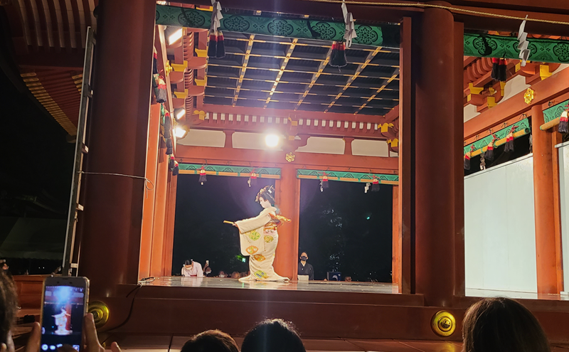 ぼんぼりへの火付けも終わり、暗くなると舞殿で日本舞踊が奉納されます。こちらも必見です。