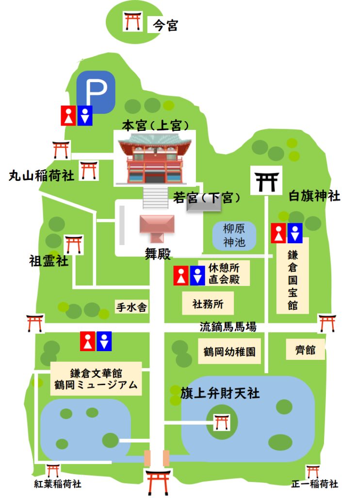 鶴岡八幡宮境内の化粧室の場所です。舞殿の横の休憩所の化粧室は結構混んでいます。個人的に穴場は国宝館にある化粧室です。あまり知られてないので比較的空いている気がしますが、国宝館を利用した人のみが利用可能です。
