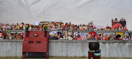Dolls and other items are placed in front of the Kannon statue, and monks chant sutras.