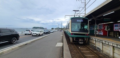 江ノ島駅、腰越駅、鎌倉高校前駅、七里ヶ浜駅と通過。鎌倉高校前の景色は最高ですね。真正面に海、右てに江ノ島、晴れていればその奥に富士山も見えます!
