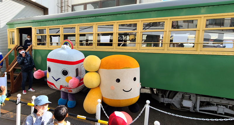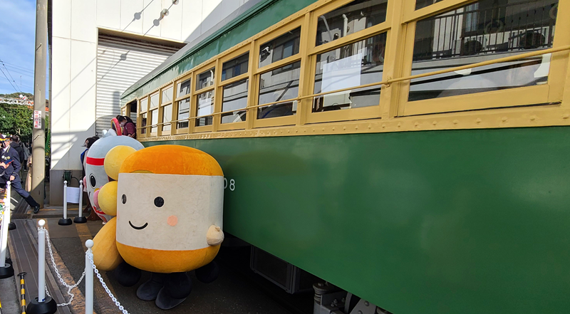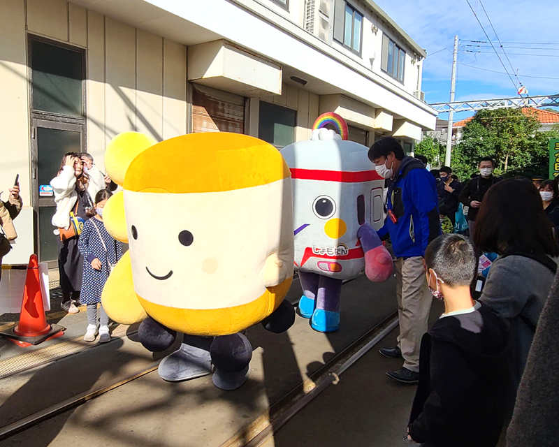江ノ電のマスコット「えのん」と大船モノレールのマスコット「しょもたん」も遊びにきてました。えのんは、身体が江ノ電の「江」なんですよね。