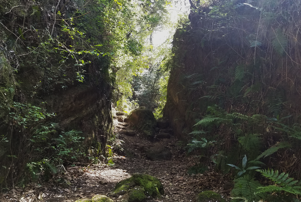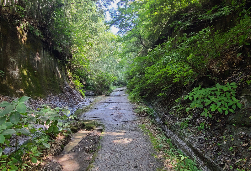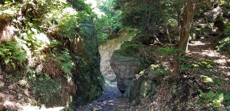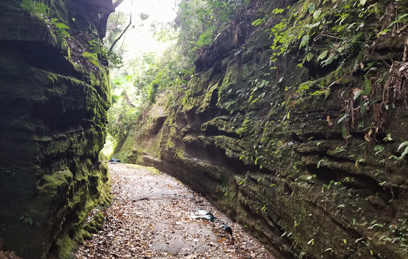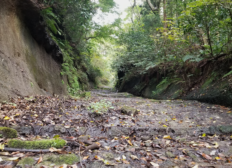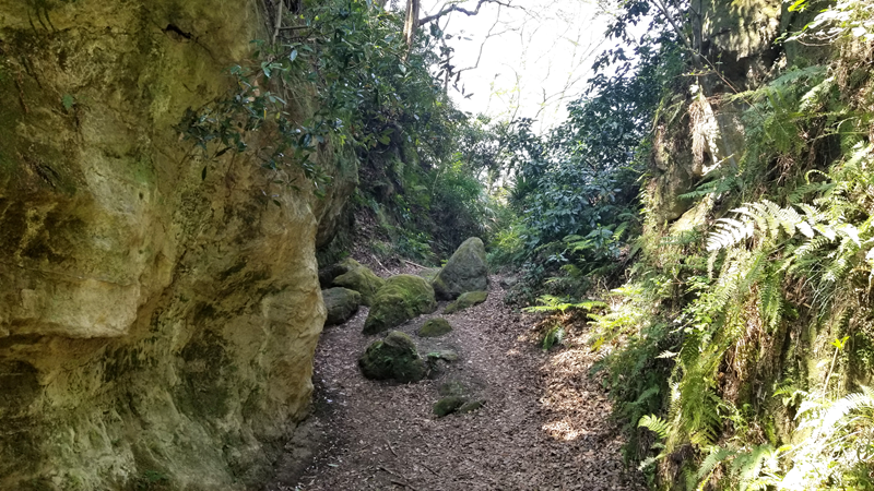 大仏切通は、長谷から常盤を経て藤沢方面へ抜ける道で、狭く急峻な古道の姿をよく残す国指定史跡です。道の両側には苔むした高い岩壁が迫り、鎌倉らしい険しい山道の雰囲気を今に伝えています。
