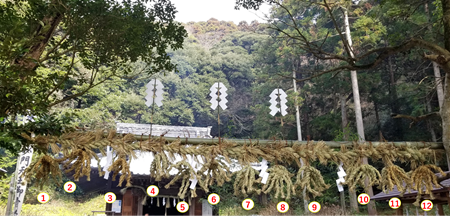 注連縄とは、神社の鳥居などに張られる縄のこと。注連縄を張ることで外からの不浄な物を神前や神聖な区域へ触れさせないと言う意味があり、神聖な場所と不浄な外界の境界線となる。そのため、神社の周辺やご神木にも張られることが多い。家庭でも正月には玄関に注連縄飾りを取り付けるなど、普段から神棚に張る習わしがある。注連縄の起源は、日本神話のなかで天照大神(あまてらすおおみかみ)が引き篭もっていた天岩戸(あまのいわと)から出たときに、もうなかへ入れないように神々が注連縄で入口を塞いだことにあると言われています。形はいくつか種類があり、編み方は左ひねりが一般的。出雲大社の物が、日本最大級の注連縄として有名である。