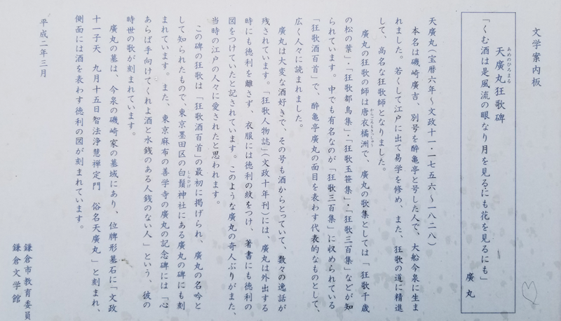 参道の入り口には、江戸時代の狂歌師・酔亀亭天広丸(すいきていあめのひろまる)の、「くむ酒は 是(これ)風流の眼(まなこ)なり つきを見るにも 花を見るにも」と刻まれた歌碑があります。酔亀亭天広丸は本名を磯崎廣吉といい、今泉に生まれた江戸中期の狂歌の達人だそうです。