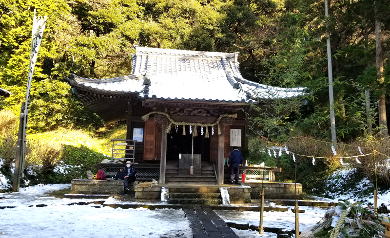 午前9時ごろから大注連を作り始めます。縄を7本と8本と12本作りつるしていきます。編み上がったのが11時半ごろで、そこから神事が執り行われます。神主さんの詔が始まったのが12時22分頃からでした。参加は15人ぐらいでした。私が行った2022年の時は、9時過ぎに行ったので、縄が出来上がるまで2時間ほど、横の今泉寺の境内で待っていました。(2022年情報)