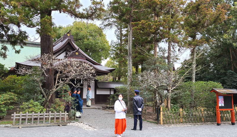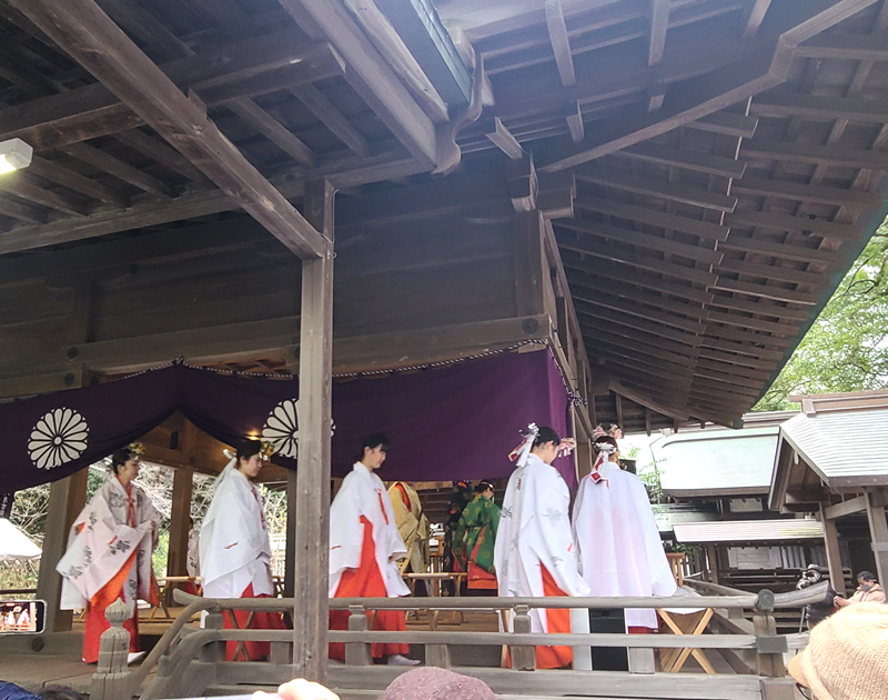 15時前に社務所から神職と巫女さんが出てきます。本殿に上がり、神事を執り行います。
