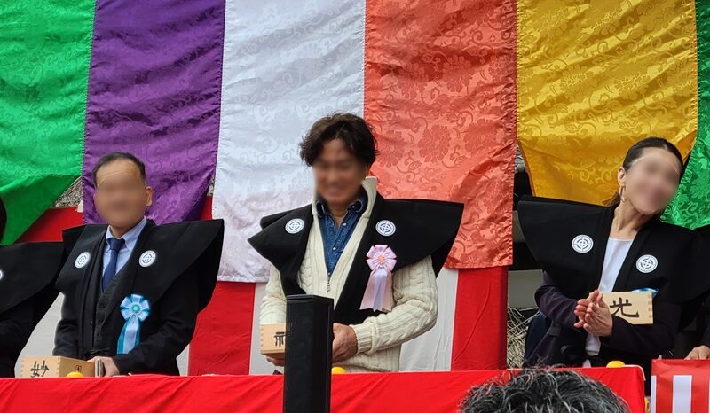 顔ぼかしてますが、ミス鎌倉の横にいるのは、蛭子能収さんです。蛭子さんは、段葛の灯篭とか丸山稲荷社に鳥居も奉納されていますね。(行かれた際にはぜひ確認を)