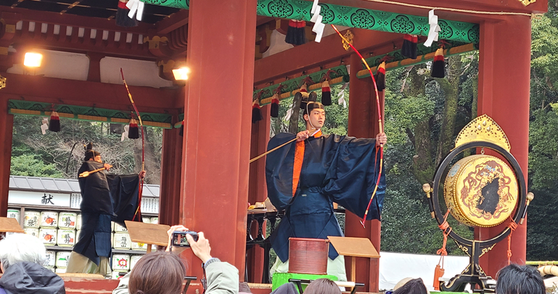 13時30分過ぎに始まりました。2人の神職が矢をつがえていない弦を鳴らします。外では弦を鳴らした回数を数えてました。「今6回よっ」て合図しているようです。(つい撮ってしまいました)