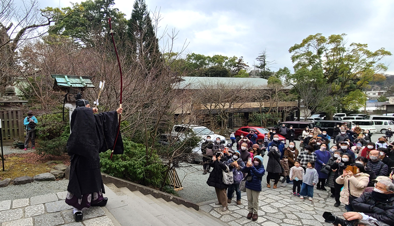 豆まきに先立ち、衣冠装束に身を正した神職が、矢をつがえていない弓の弦を鳴らし、その音で魔を祓う「鳴弦式」が執り行われます。
