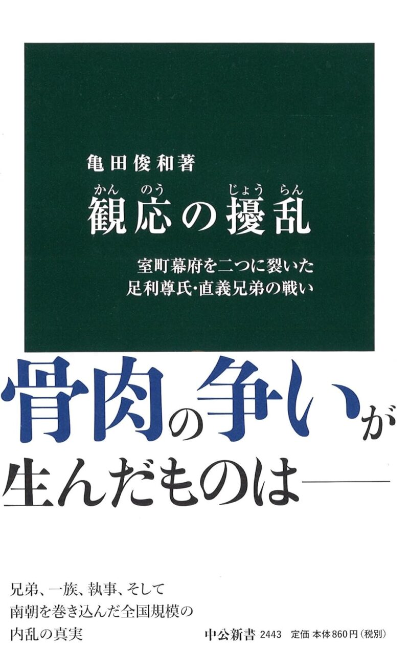 今回のお勧め本2冊目は、 亀田俊和著『観応の擾乱 – 室町幕府を二つに裂いた足利尊氏・直義兄弟の戦い』中公新書 2017 です。