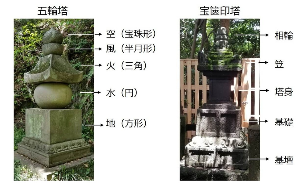 五輪塔は、インドの「五大思想(地・水・火・風・空)」を起源とし、これら五つの要素を五つの輪に見立てて石塔の形にしたものです。日本では平安時代から鎌倉時代にかけて主に供養塔として造立され、とくに関東地方では鎌倉時代に多く見られます。