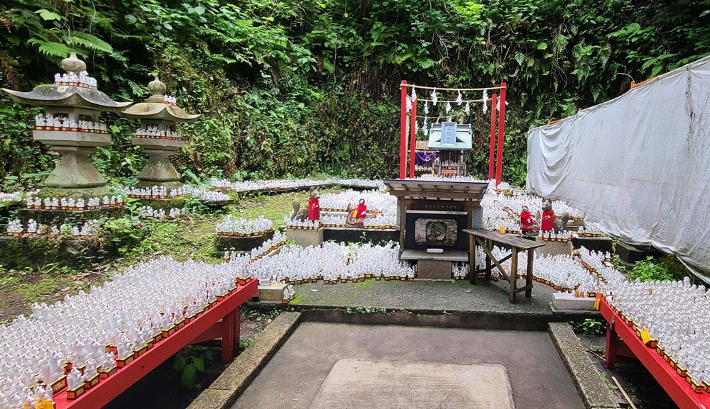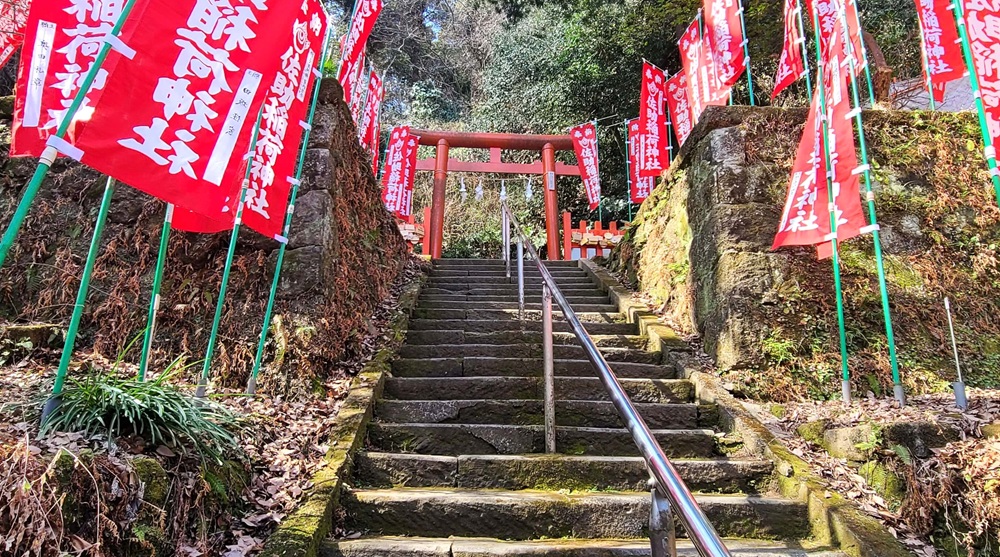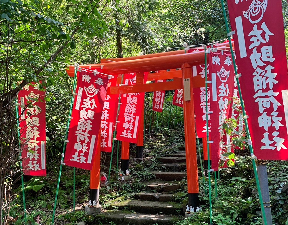 大きな石碑を右手に進むと赤い鳥居が見えてきます。数では京都の伏見稲荷に負けるかもしれませんが、壮観です。数は49基あるそうです。