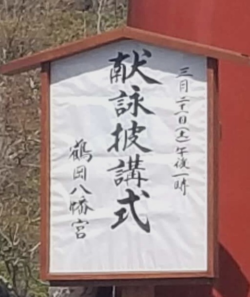 このような故事をもとに、当宮では、春3月下旬、舞殿において「献詠披講式」を執り行います。当宮の披講式はご神前に和歌を献詠する神事として執り行われ、披講の諸役は宮中歌会始披講会の先生方の指導を受けた当宮神職が、武家の都・鎌倉の歌会に相応しく直垂に引立烏帽子という出立ちで務めます。披講される和歌は毎年、実朝公の1首、他は公募に依ります。