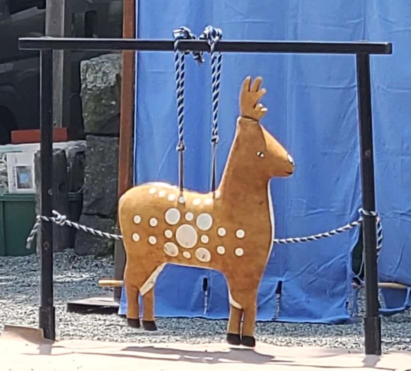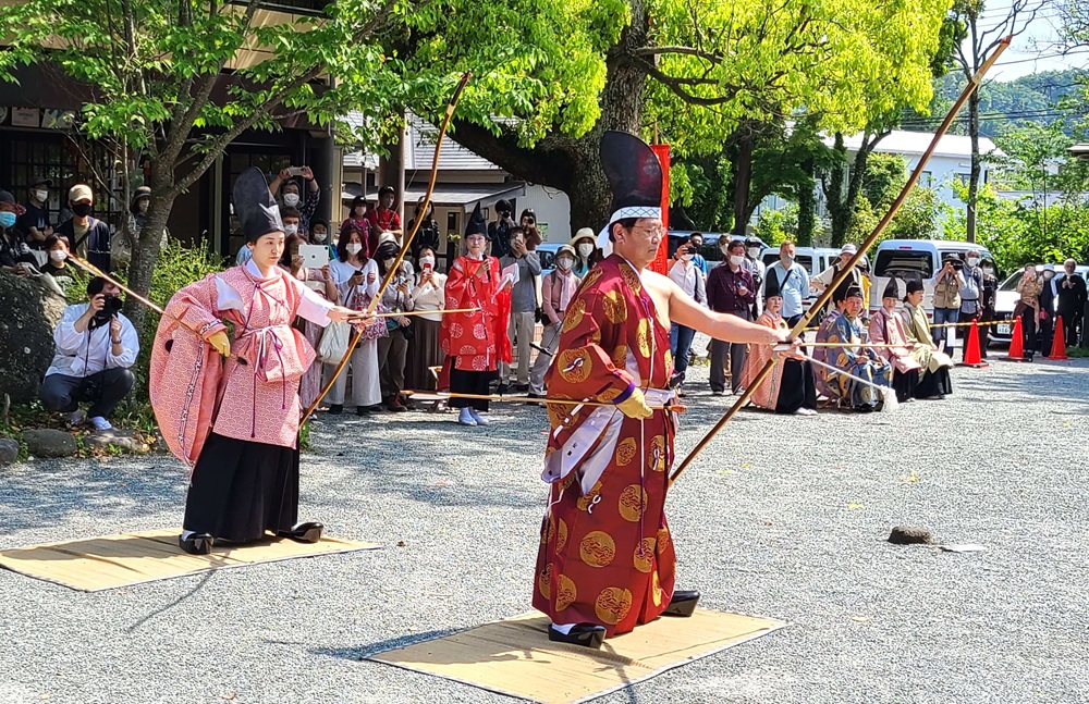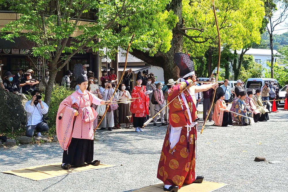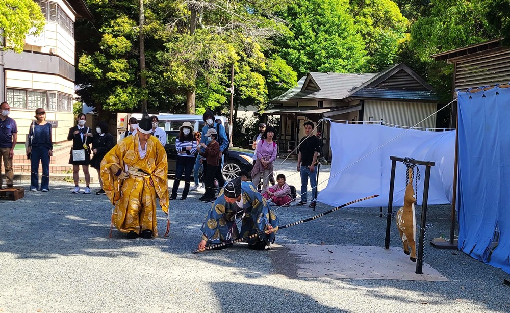 射手は前弓(まえゆみ)と後弓(あとゆみ)の二組に分かれ、鹿の形をした的を射て的中数を競います。