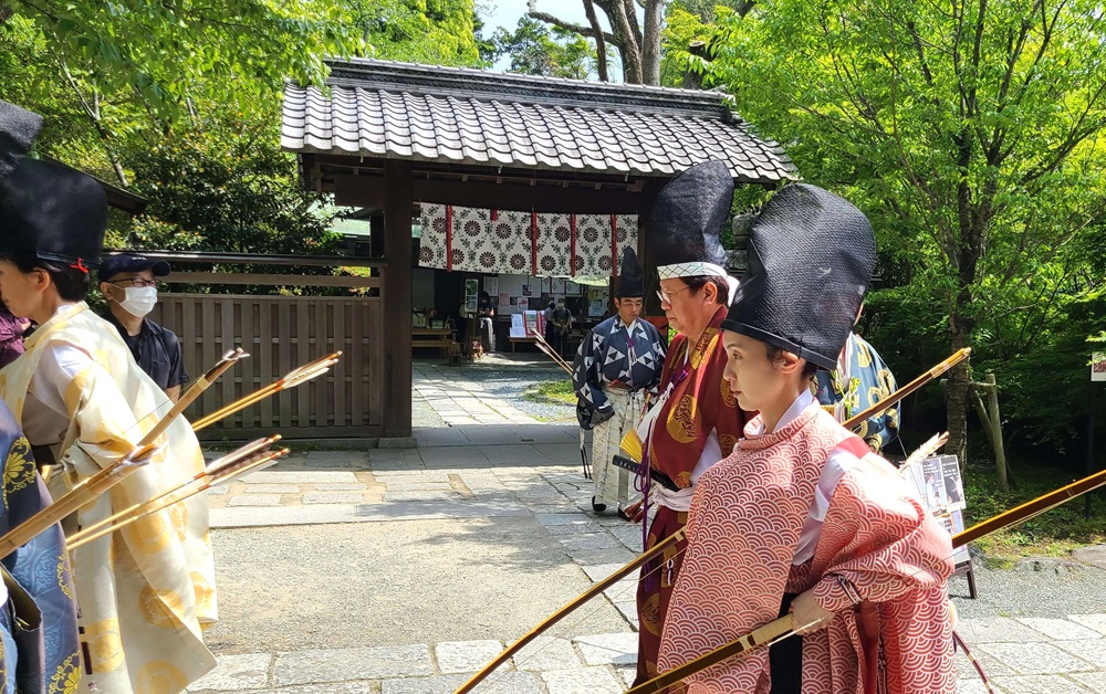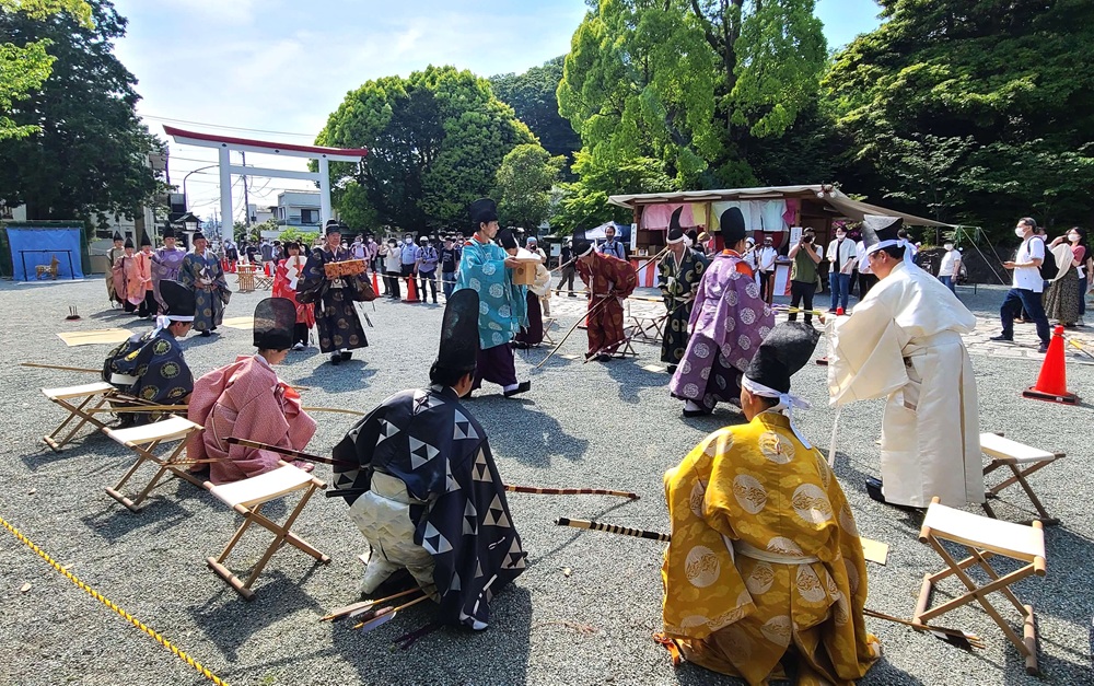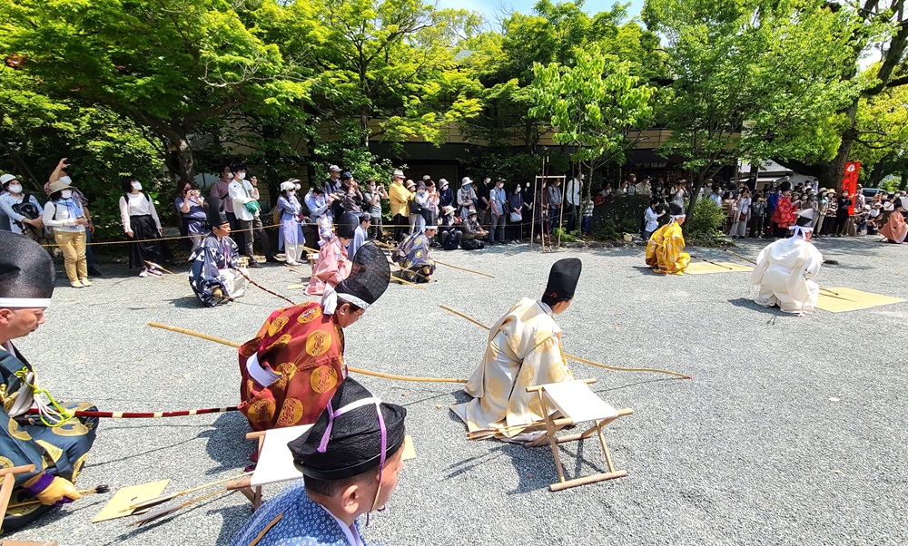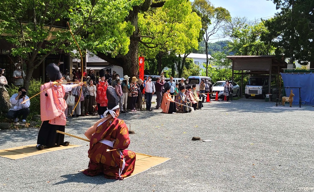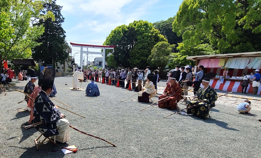 射手は烏帽子・直垂などの古式装束を着用し、単なる的中だけでなく、体配(所作)、弦音・矢飛び、的中の有無、的中後の矢の落ち所や経緯、これらを総合的に奉行が判断し、「当たり」が決まる。競技中は候(そうろう)言葉による古風な問答が行われます。