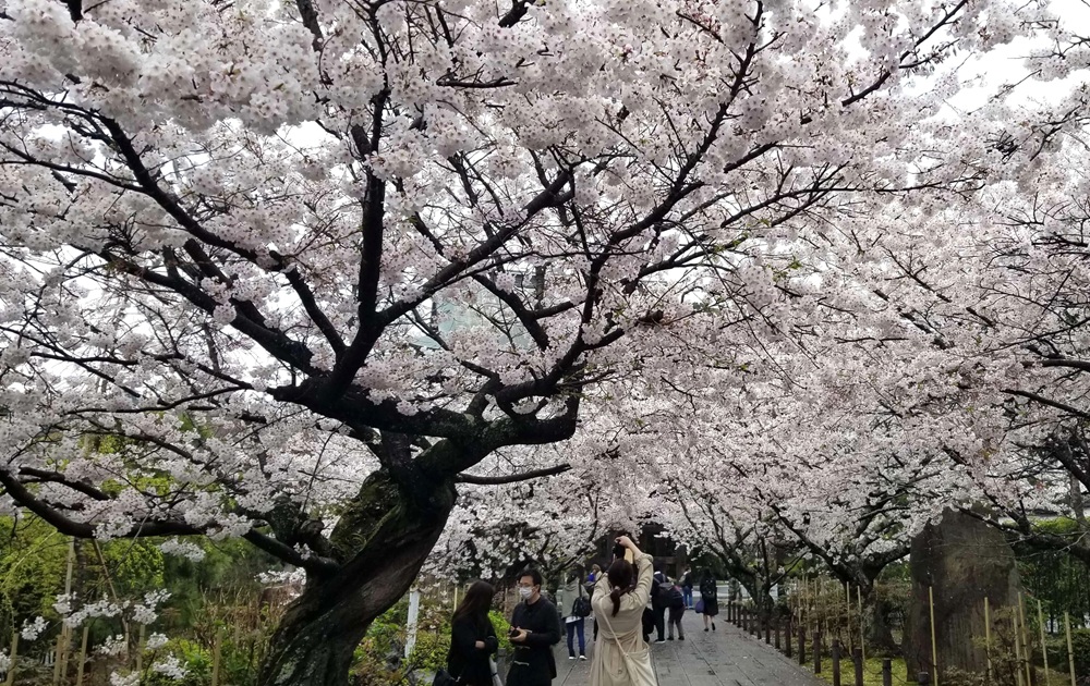 Cherry blossoms bloom along the road leading from Tsurugaoka Hachimangū Shrine to Hokke-dō Hall.