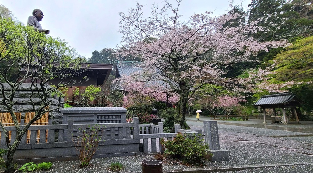 From the other torii gate of Goryo Shrine, head toward Hase Station. Once you reach the road, turn left and make your way to the Great Buddha at Kōtoku-in Temple (admission fee required). The cherry blossoms there are truly spectacular.