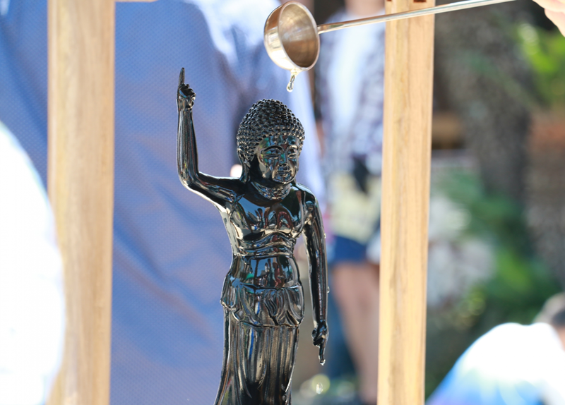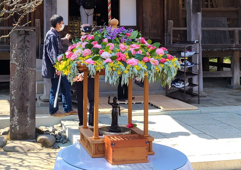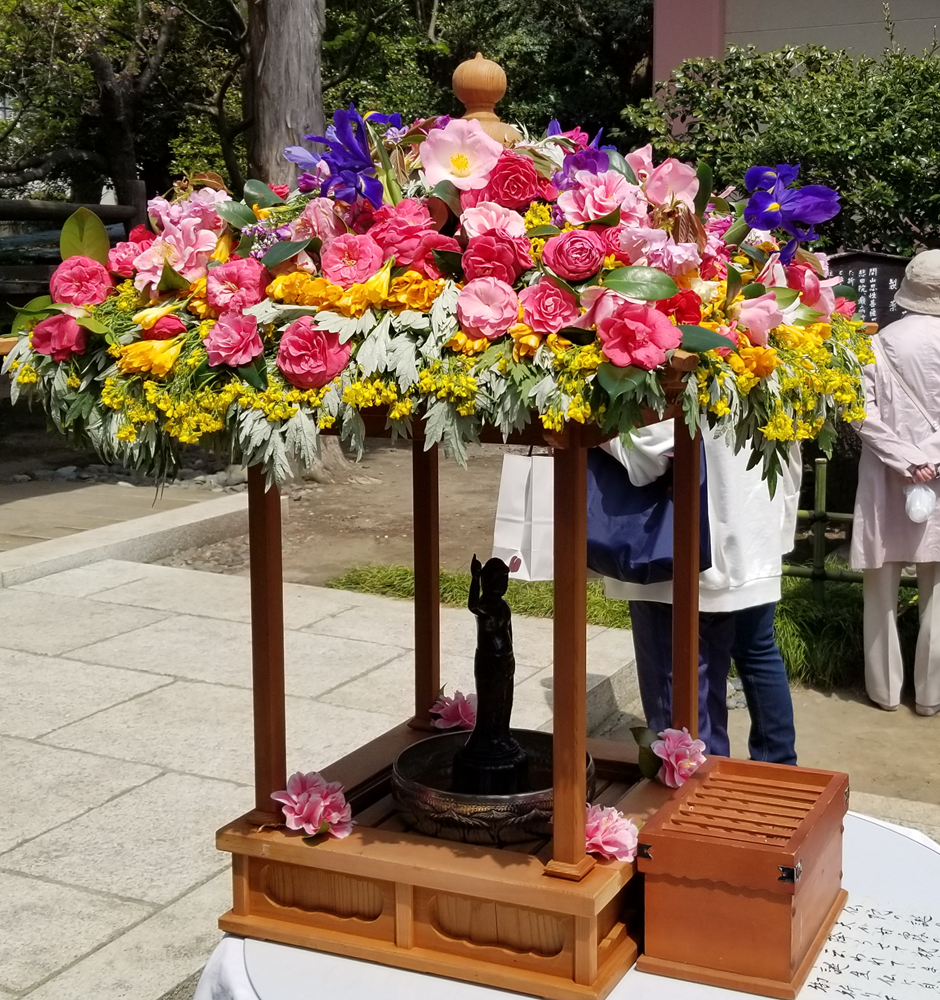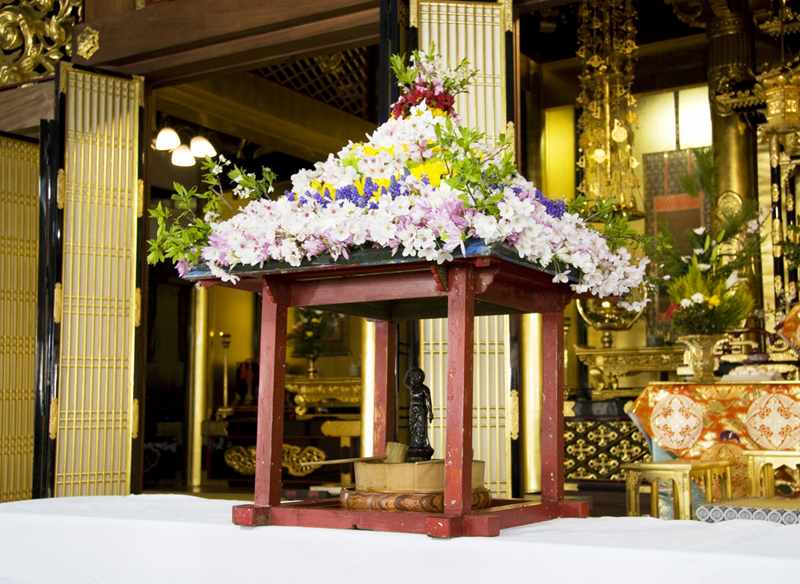 The hanamidō (floral pavilion) is decorated with flowers, and sweet tea (amacha) is poured over the statue of the newborn Buddha to celebrate his birth.