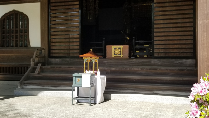 A floral pavilion (hanamidō) is usually placed in the hattō (main hall), and all the monks of the temple gather for the ceremony.