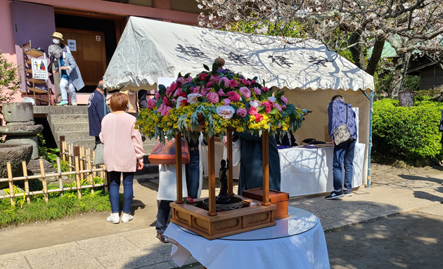 Kanbutsue is a ceremony in which sweet tea (amacha) is poured over a statue of the newborn Buddha placed inside a beautifully decorated floral pavilion, and the tea is also offered to visitors.