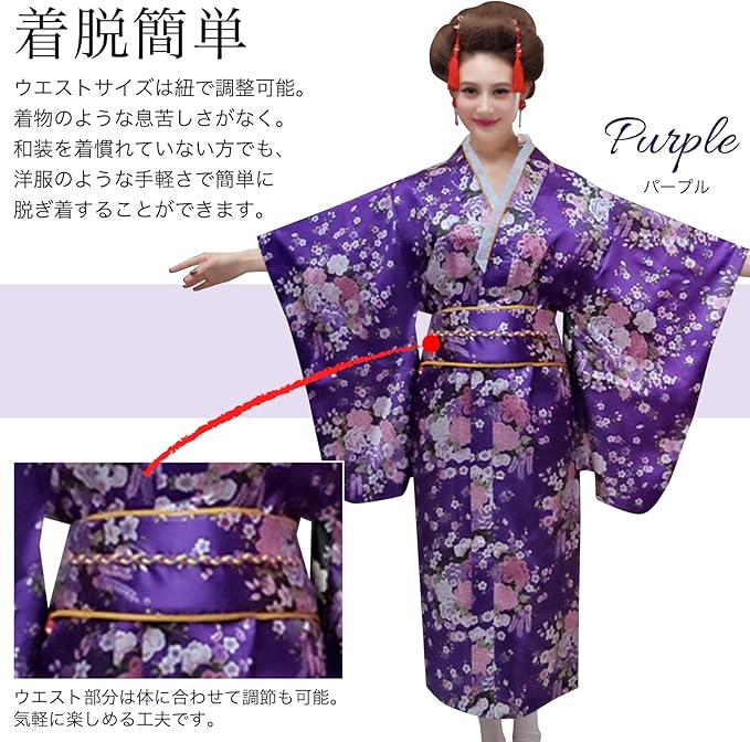 Kimono dress with vivid and gorgeous flowers printed on it. The obi comes with a cute bowknot ribbon at the back. The colors available are elegant red, bright blue, chic black, neat white, and glossy and colorful purple. You can enjoy the Japan in this kimono.【PR】