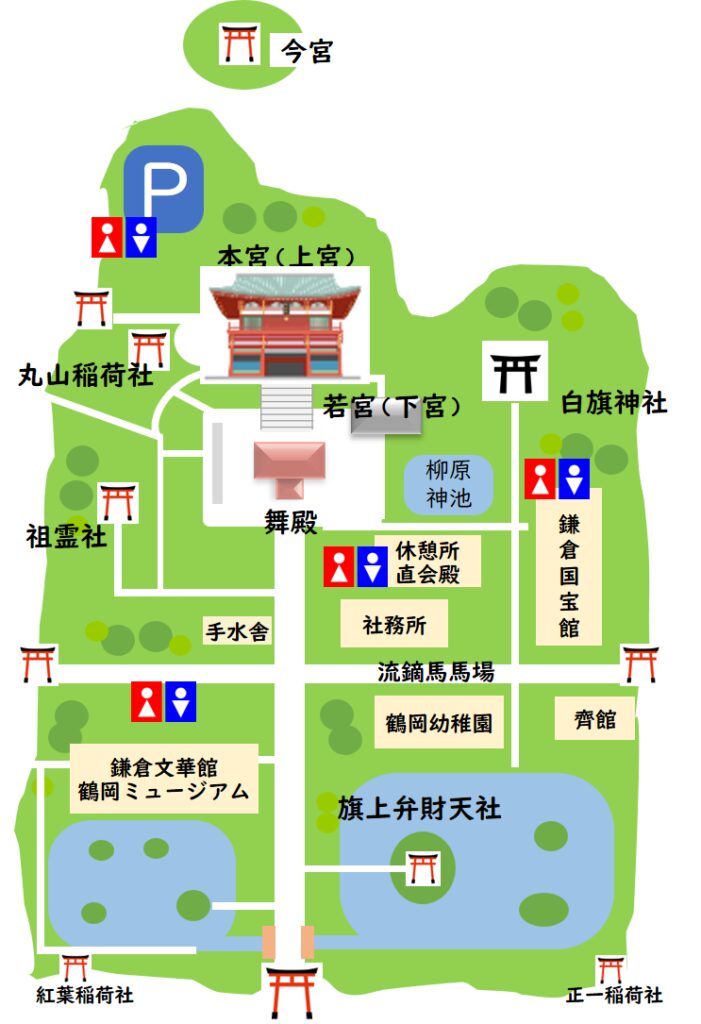 These are the locations of restrooms within the grounds of Tsurugaoka Hachimangu Shrine.