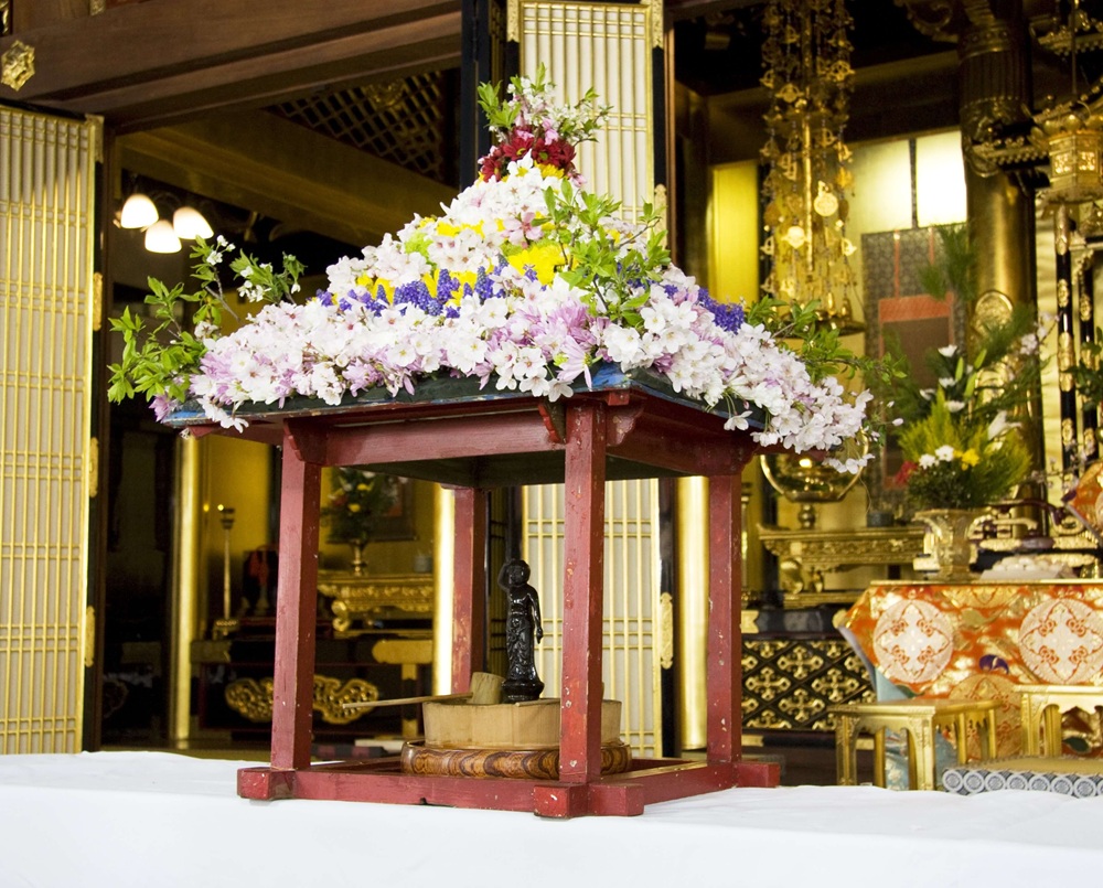 The hanamidō (floral pavilion) is decorated with flowers, and sweet tea (amacha) is poured over the statue of the newborn Buddha to celebrate his birth.